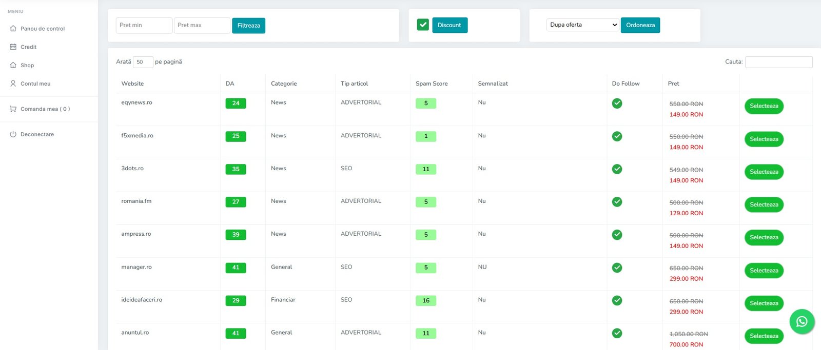 Da, poți selecta exact site-ul dorit în funcție de domeniu, autoritate (DA/DR), trafic estimat sau preț.
